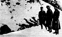 | Угорські та польський солдати біля тіл розстріляних вояків Карпатської Січі. Кордон Карпатської України та Польщі. Березень 1939 р. |