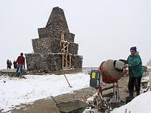 | Будівництво монументу на Верецькому перевалі. Зйомка 17 березня 2008 року. |