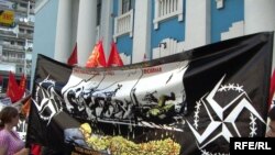 У руках пікетувальники тримають прапори КПУ та плакати з написами «НАТО – ні!».