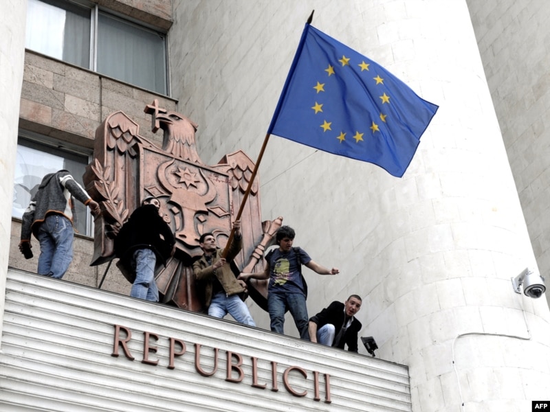 Демонстранти з прапором ЄС у захопленому ними парламенті Молдови. Кишинів, 7 квітня 2009 р.