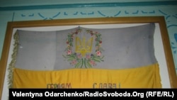 «Вище підняли, а вони там, на лицьовій стороні, прищеплені обидва шпильками. Історія тих прапорів, за розповідями покійної людини, яка тут багато років прислуговувала в церкві, така: вишили його місцеві люди, а прапор потрапив у престол, бо був священик тут у сорокових роках, який пішов в УПА й не повернувся. Священик автокефальний, адже церква у період війни, за Полікарпа Сікорського, тут була автокефальною», – розповідає отець Євген.