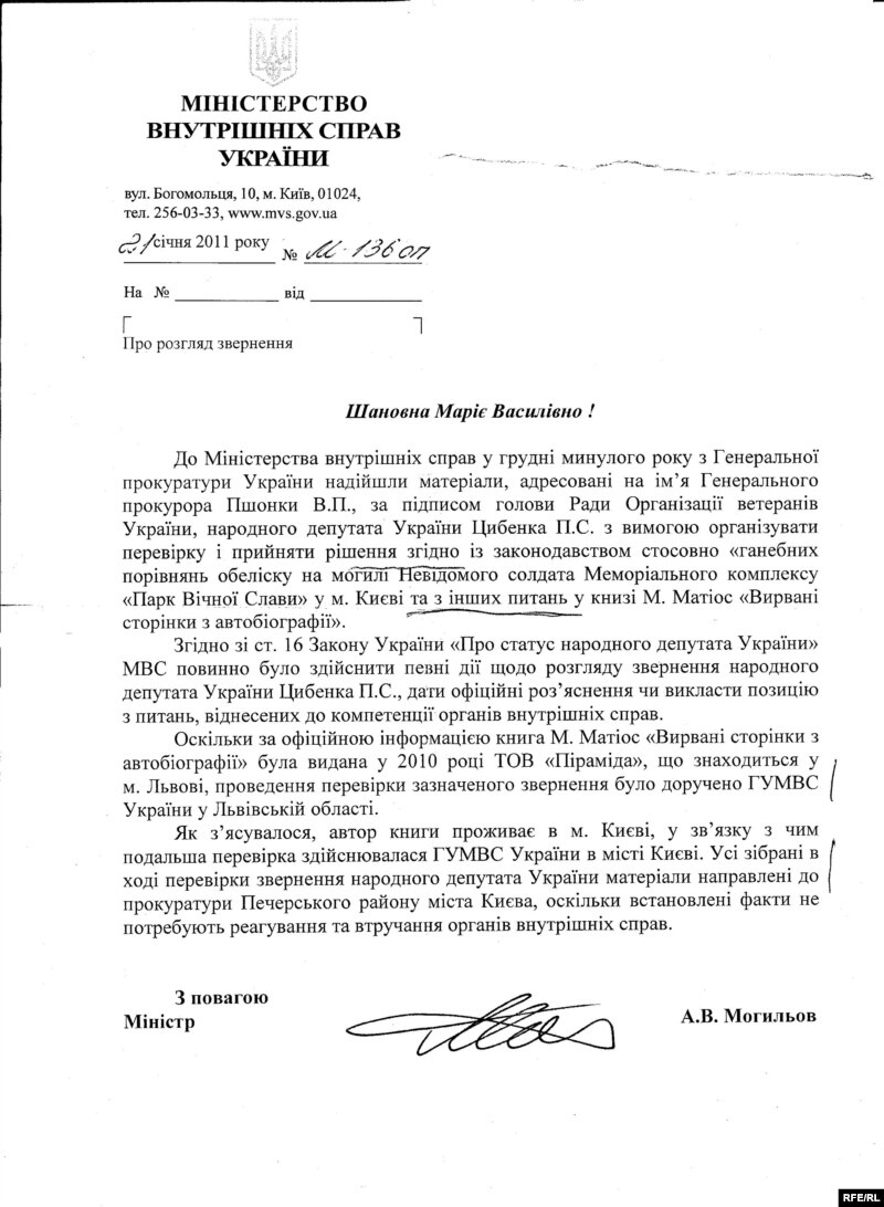 Лист надійшов поштою. У ньому, зокрема, міністр повідомляє, що правоохоронні органи діяли згідно з матеріалами, надісланими Генеральною прокуратурою. Могильов зазначає, що «на ім’я Генпрокурора Пшонки В.П., за підписом голови Ради Організації ветеранів України, народного депутат України Цибенка П.С. з вимогою організувати перевірку і прийняти рішення згідно із законодавством стосовно «ганебних порівнянь обеліску на могилі Невідомого солдата Меморіального комплексу «Парк Вічної Слави» у м. Києві та з інших питань у книзі М. Матіос «Вирвані сторінки з біографії».