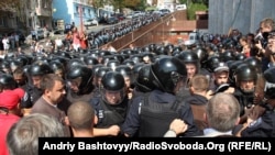 Бійці спецпідрозділу «Беркут» відтіснили народних депутатів та тих, хто протестує проти ухвалення мовного закону, від службового входу Українського дому.