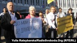 У руках вони тримають плакати «Без мови сьогодні – без держави завтра», «Депутати, не будьте яничарами», «Нації вмирають не від інфаркту. Спочатку їм відбирає мову».