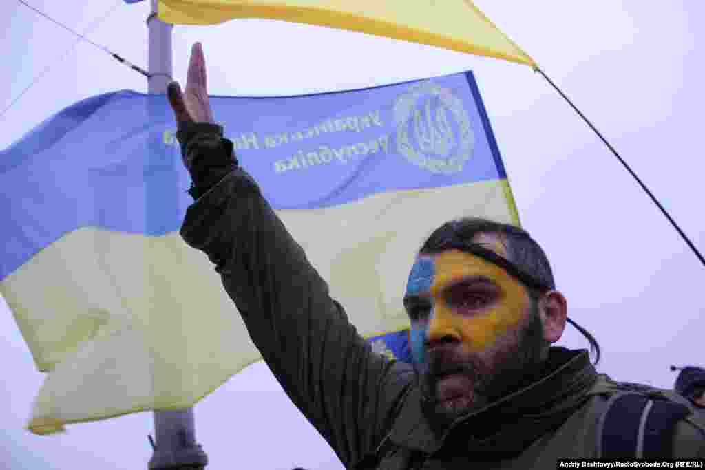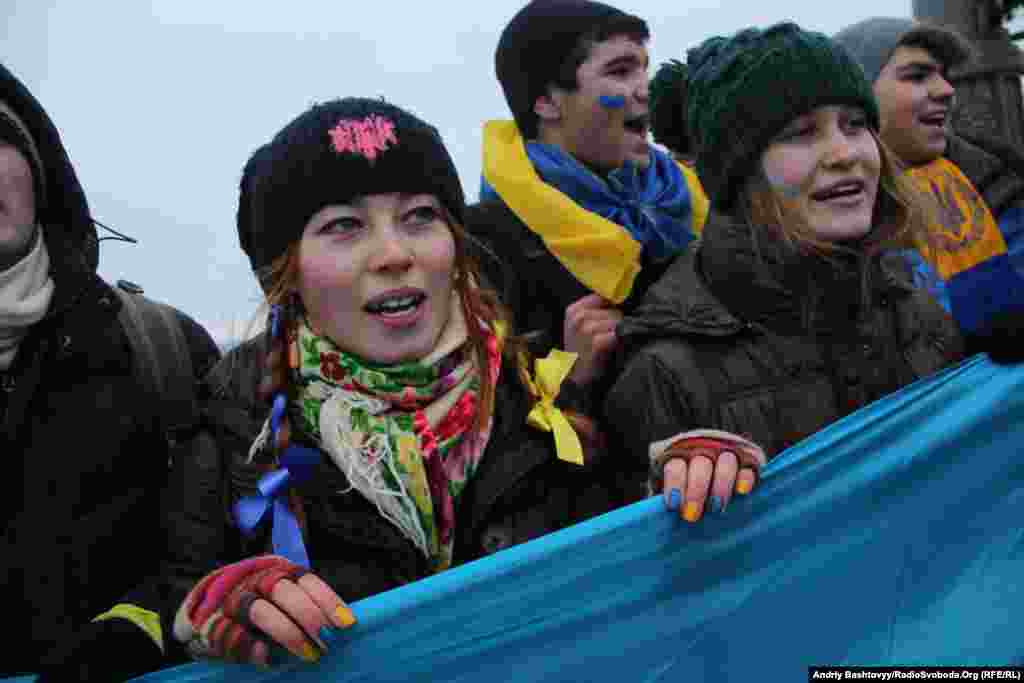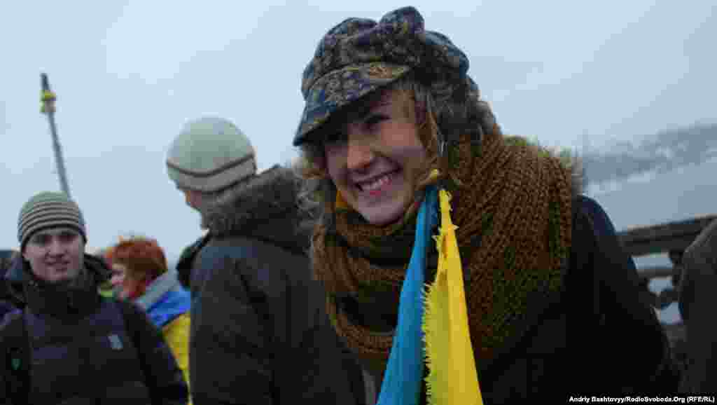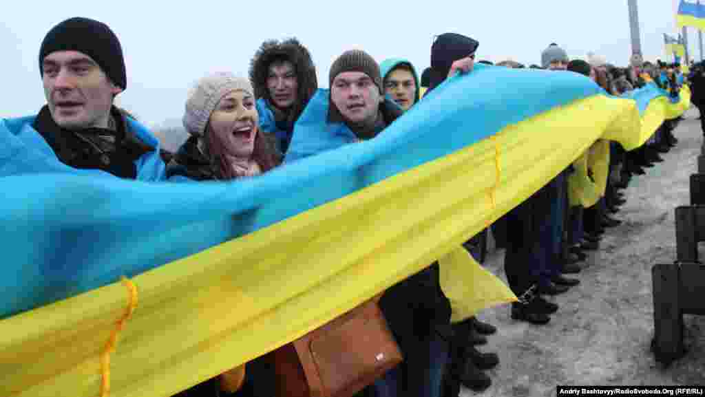 Учасники традиційної акції зустрілися посередині мосту Патона у Києві, розтягнули український прапор та співали національний гімн.