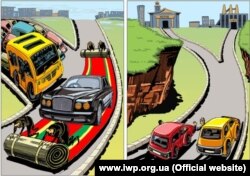 Тут зібрані карикатури, на яких зображені дві реальності – українська і європейська. Карикатури були створені відомими українськими художниками: Мариною Туровською, Костянтином Казанчевим, Ігорем Бежуком та Олексієм Кустовським на замовлення Інституту світової політики. Ми охопили максимальну кількість сфер, які наглядно демонструють, чому ми поки що не є кращою стороною Європи. Але ми можемо нею стати!