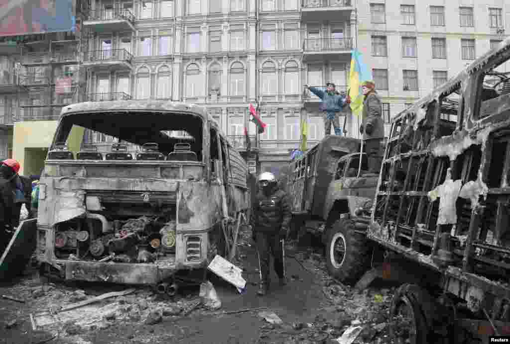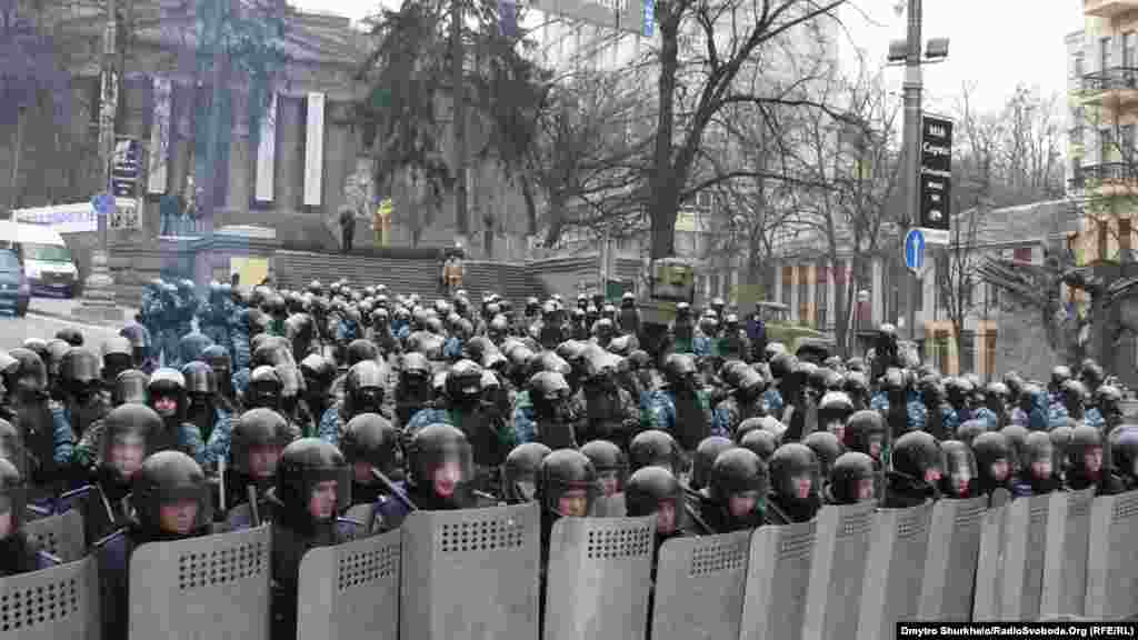 На вулиці Грушевського в Києві, де цієї ночі відбувалися масові заворушення, ситуація стабілізувалася. Ані зі сторони мітингувальників, ані з боку правоохоронців силових дій не спостерігається. Волонтери прибирають вулицю від сміття і приносять їжу та чай для мітингувальників. Дехто із людей розмовляє із правоохоронцями.