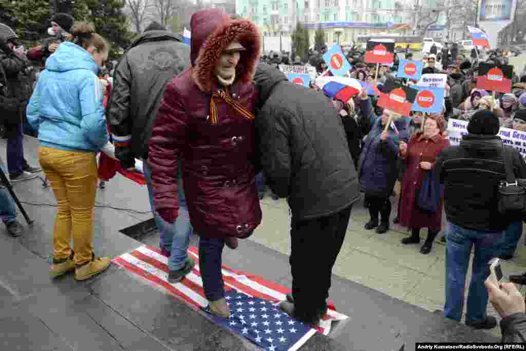 В Луганську прихильники федералізації України витирали ноги і топталися на прапорі США