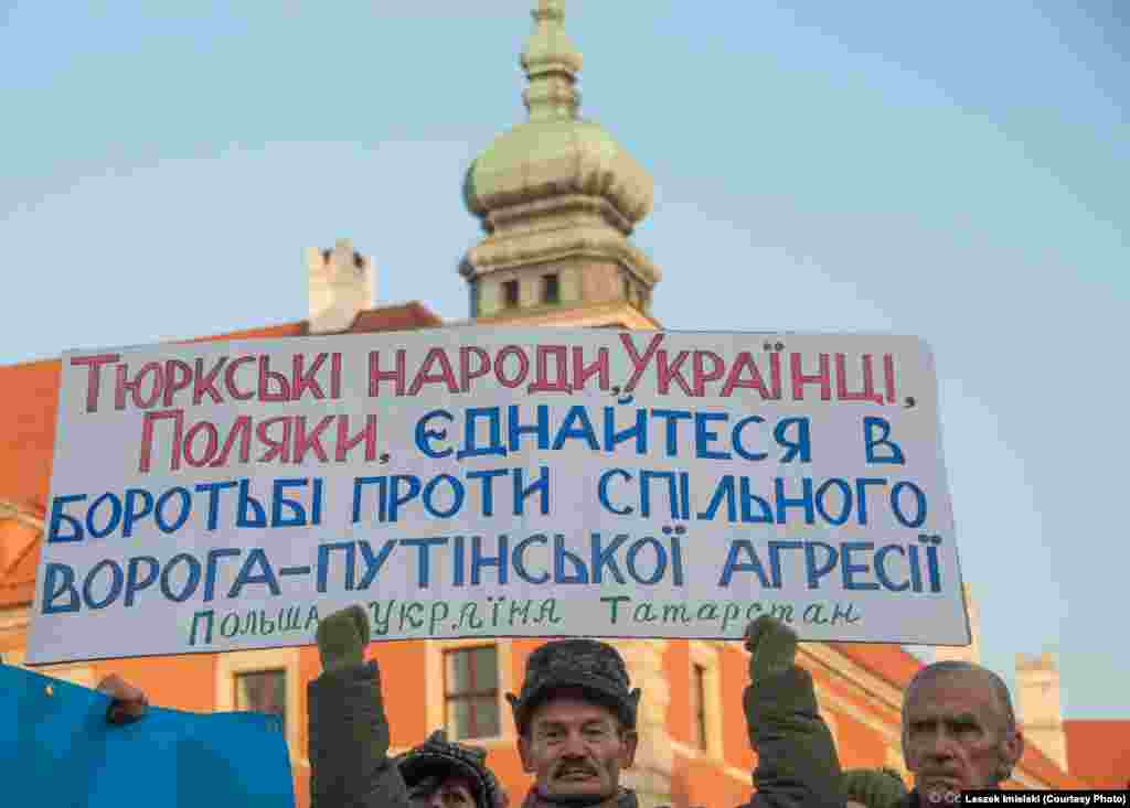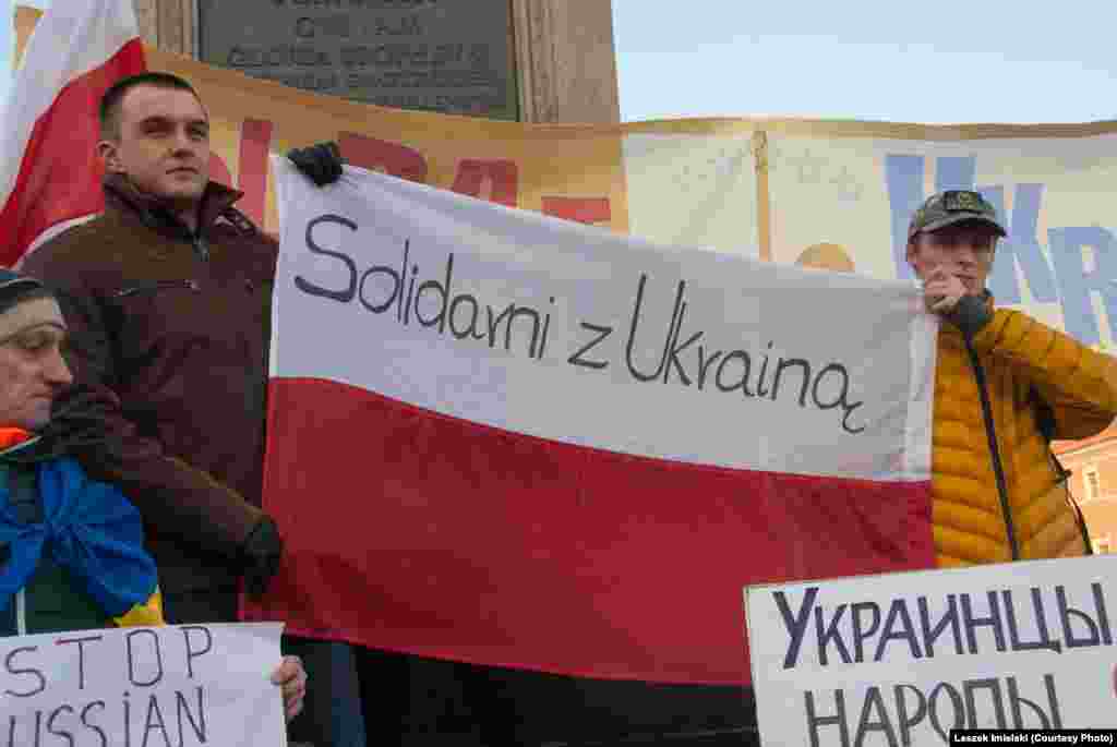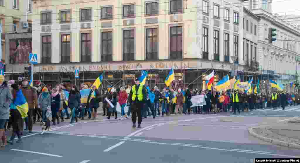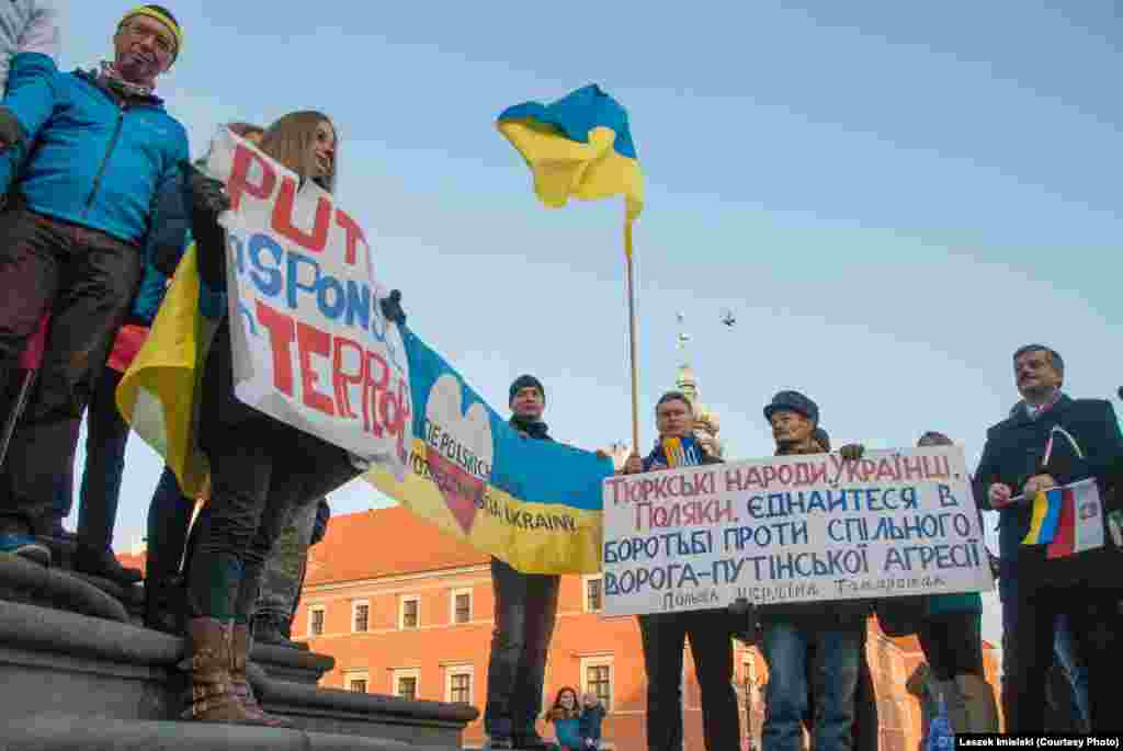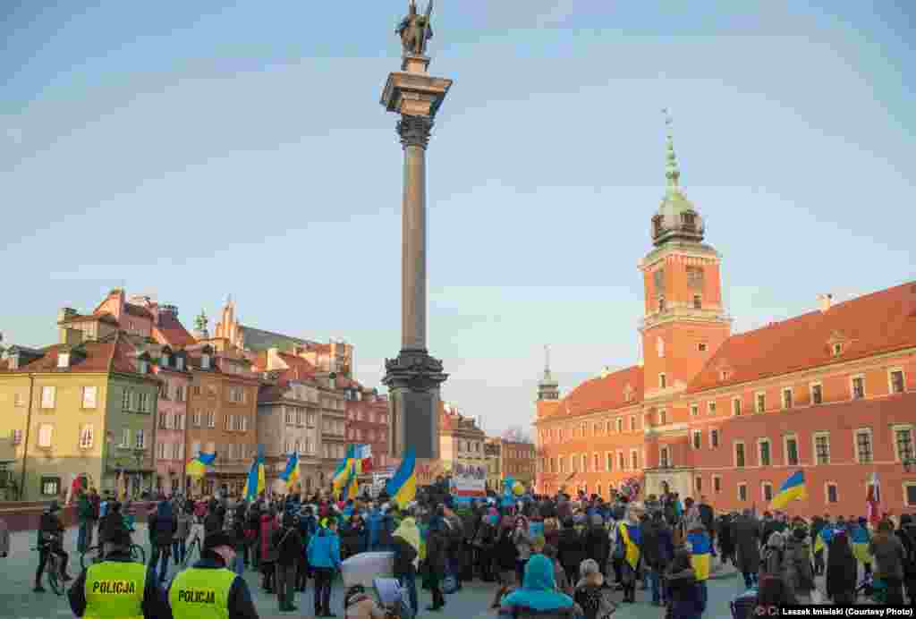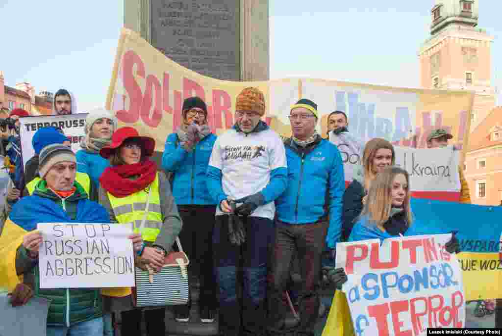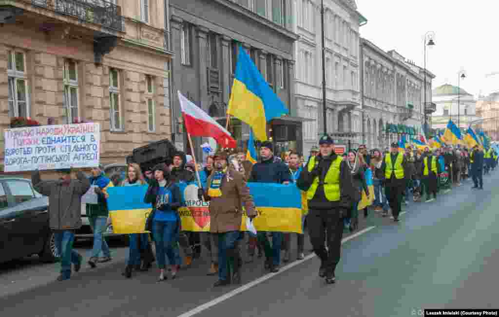 Кілька сотень учасників пройшлися центром столиці Польщі, щоб висловити підтримку українцям та віддати шану загиблим біля дошки пам’яті під посольством України у Варшаві. (Фото надані фундацією «Відкритий діалог»)