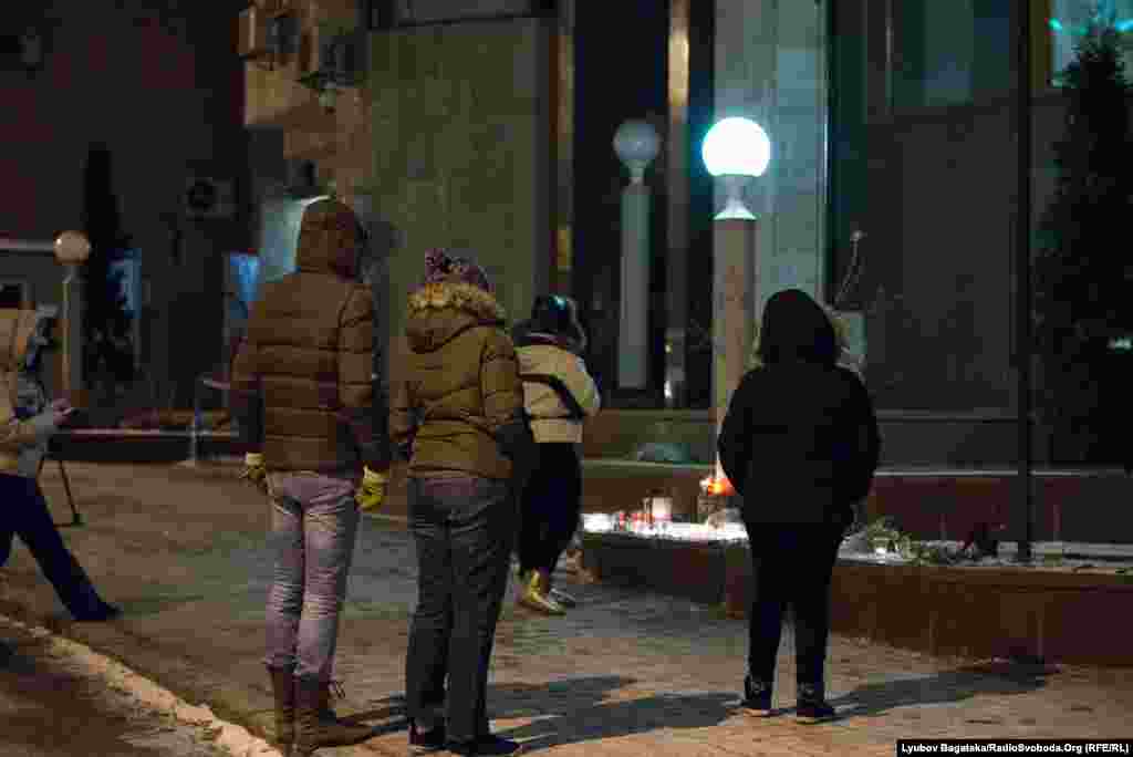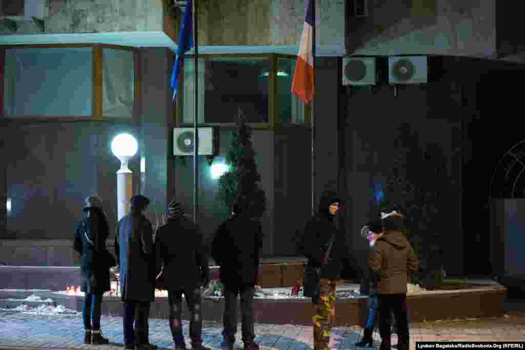 Кілька десятків людей прийшли до Посольства Франції в Україні, аби покласти квіти та запалити свічки. Кияни принесли під будівлю посольства кілька плакатів на підтримку свободи слова та на знак співчуття родинам і колегам загиблих, а також кілька карикатур, що раніше пулікувалися у тижневику Charlie Hebdo. У середу, 7 січня, у результаті нападу на редакцію було вбито 12 людей, ще 11 були поранені.