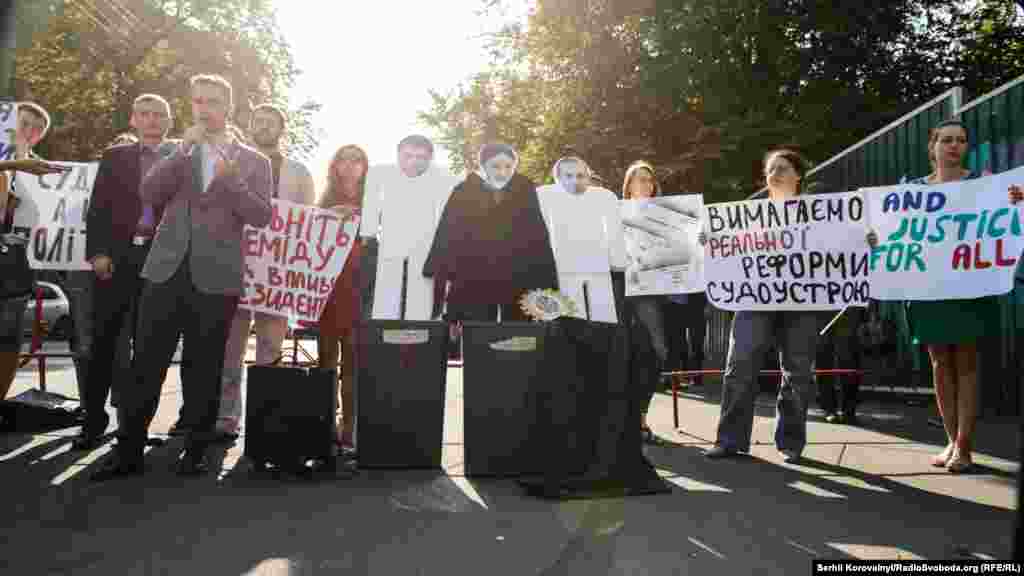 Напередодні засідання Конституційної комісії біля Адміністрації президента активісти руху «Реанімаційний пакет реформ» відкрили перший пам’ятник українській Феміді – смітники зі скульптурами недоброчесних суддів. За задумом організаторів, арт-об’єкт має привернути увагу членів Конституційної комісії до низького рівня довіри українського суспільства до судової влади.
