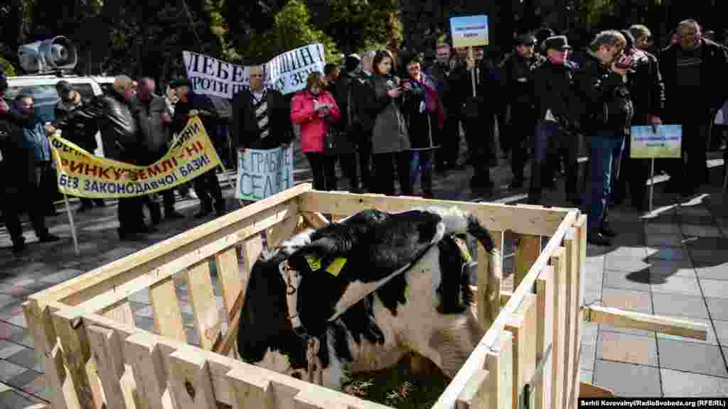 В Києві під Верховною Радою зібралися декілька десятків фермерів. Вони заявляють про проблеми на ринку землі, рейдерські захоплення фермерських господарств та відсутність розвитку сільського господарства. Під будівлю парламенту активісти притягнули теличку як символ фермерства. Активісти додали: якщо після їхньої акції нічого у фермерстві не зміниться, то вдаватимуться до більш радикальних дій.