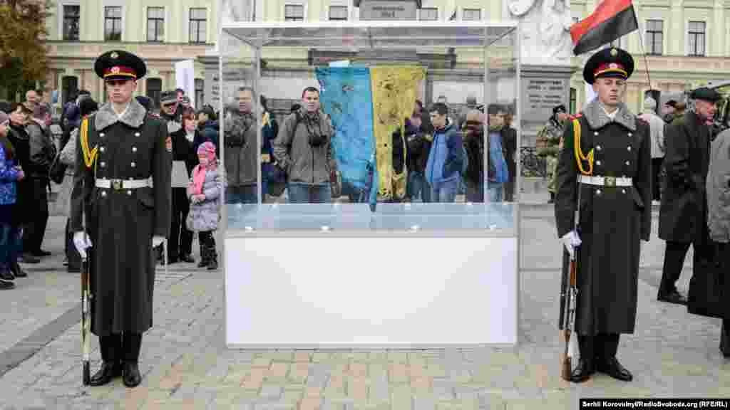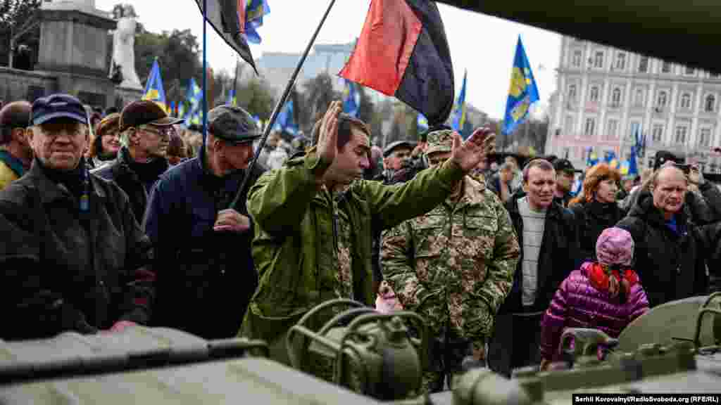 У центрі столиці до Дня захисника України відкрито виставку української військової техніки. На Михайлівській площі представлені зразки техніки та озброєння українського й іноземного виробництва, що перебувають чи поступають на озброєння армії. На виставці також представили прапор із Донбасу, який українська делегація розгорнула на засіданні Генеральної асамблеї ООН під час виступу російського президента Володимира Путіна.