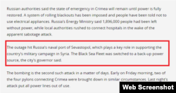 «Відключення вдарило по морському порту Росії – Севастополь, який грає ключову роль у підтримці військової кампанії в Сирії. Чорноморський флот був переведений на резервні джерела живлення, повідомив губернатор міста», – сказано в повідомленні Vice News.