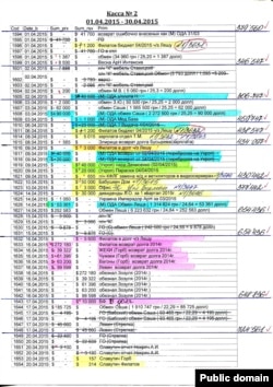 «Це невеличкі папірці, на яких написана дата, номер, слово «расход», вказуються суми, суми значні, подекуди в гривнях, подекуди в доларах США. От є: «1 млн 50 грн, курс вказаний, 45355 доларів – зарплата нардепів Укроп-Україна». Наступний папірець із підписом – 55 тисяч, написано – ОДА», – уточнив прокурор ГПУ Валерій Карпунцов, демонструючи фотокопії фрагментів «чорної бухгалтерії».