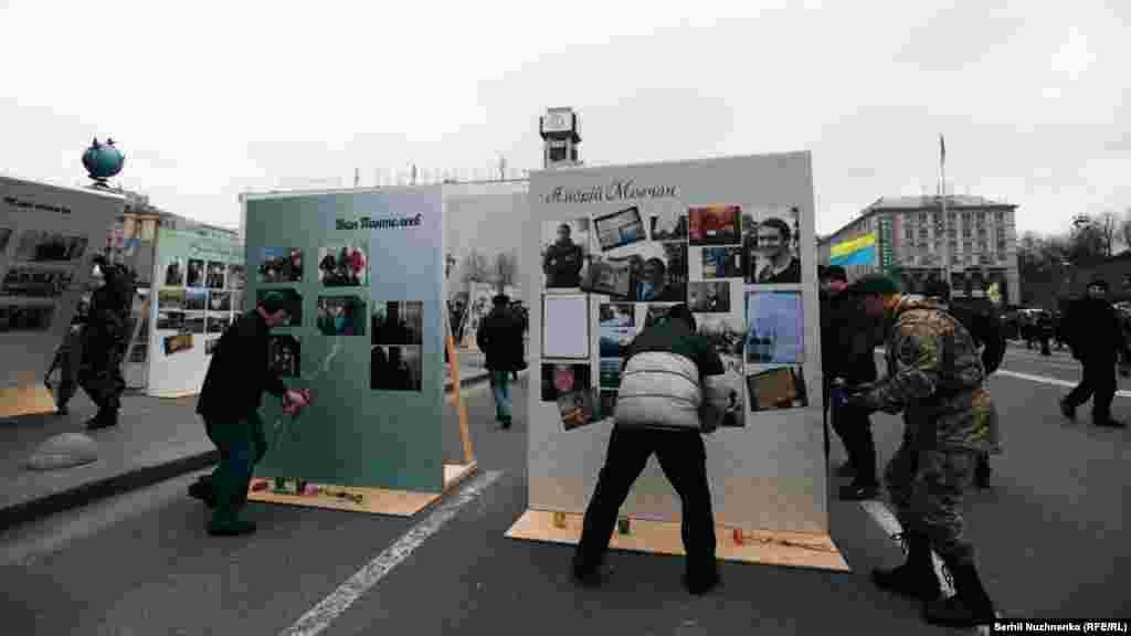 Активісти перекрили дорогу фотощитами із виставки сімейних альбомів героїв Небесної сотні. Пізніше поліція сама перекрила рух від вулиці Богдана Хмельницького до майдану Незалежності. (Фото: Сергій Нужненко)