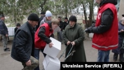 Международный Красный Крест привез в село продуктовые наборы, в которые входят сахар, чай, крупы, мука, консервы, тушенка. 17 килограмм на семью. Рассчитывают, чтобы хватило на месяц. Три месяца назад продуктовые наборы привозили всем – тогда линия фронта проходила по селу.
