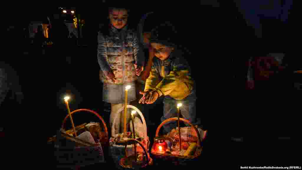Дитина затуляє свічку від вітру у Великодню ніч під час богослужінь у Володимирському соборі