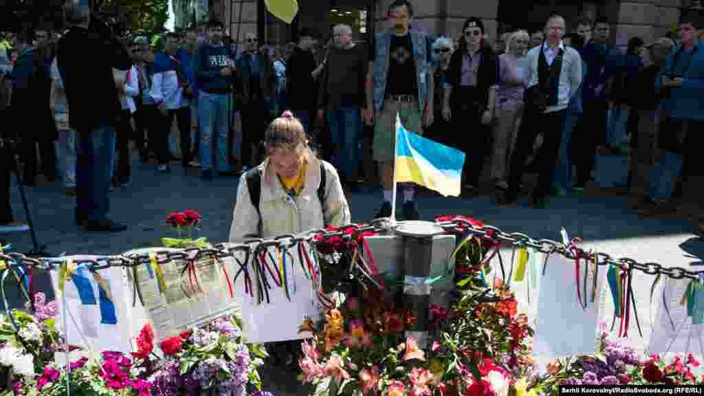 Зранку правоохоронним органам повідомили про «замінування» Будинку профспілок, тому людей на Кулікове поле, станом на 18:00, так і не пустили. Тому вони кладуть квіти на газон біля входу