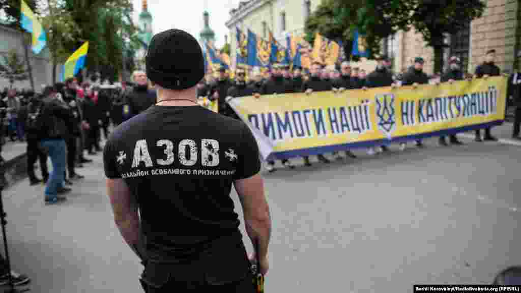 Цивільний корпус «Азов» пройшов маршем вулицями Києва до Верховної Ради. Біля парламенту активісти вимагали заборони виборів на окупованій частині Донбасу та відновлення державного кордону України. Акція, що зібрала близько 3 тисяч людей, супроводжувалася вибухами димових шашок, а на площі перед Радою азовці запалили фаєри.