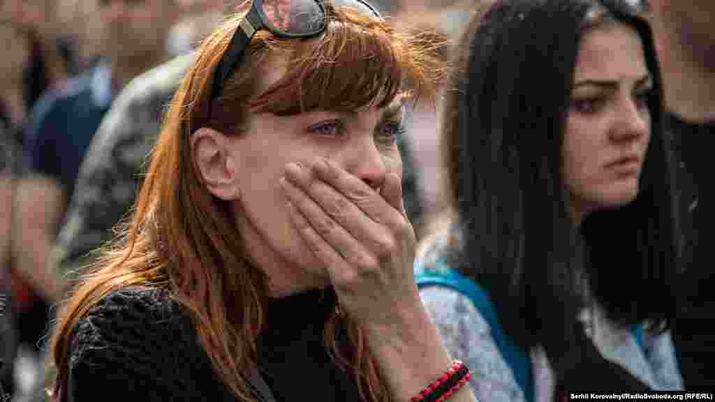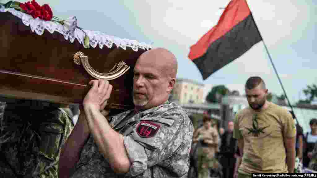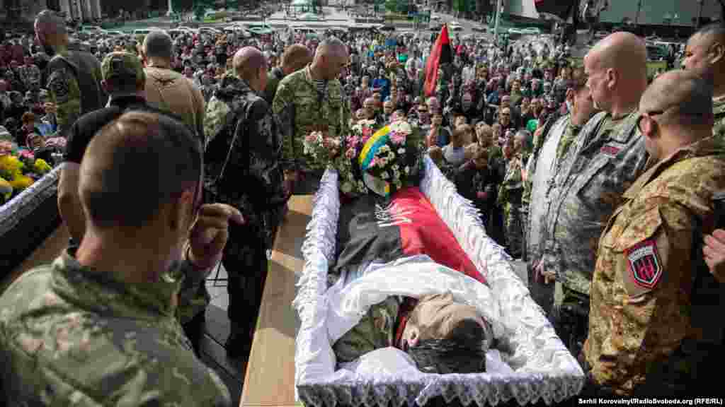 На майдані Незалежності у Києві прощалися із бійцями ДУК «Правий сектор» Робертом Маслеєм (позивний «Док») та Юрієм Гнатюком (позивний «Гуцул»), які загинули в зоні АТО 12 червня під час обстрілу шахти «Бутовка».