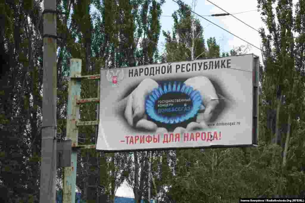 Із більшості білбордів на містян дивиться ватажок бойовиків Олександр Захарченко або його тк звані «міністри». Хоча, останнім часом реклами з Захарченком стало менше. «А то ж неможливо було їздити містом, кожні п’ять метрів – він, вже набрид усім», – зауважив у розмові з Радіо Свобода таксист Іван