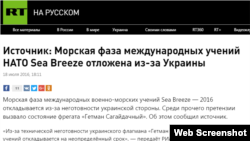 «Україна зірвала навчання НАТО» – це заголовок публікації на сайті «Дни.ру». «Джерело: Морська фаза міжнародних навчань НАТО Sea-Breeze відкладена через Україну» – а це вже заголовок на сайті видання Russia Today.