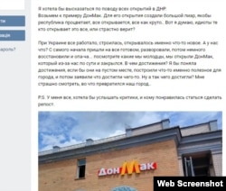 16 июля в оккупированном Донецке, в районе автовокзала Южный, на базе фаст-фуда «Макдональдс», прошло торжественное открытие кафе с названием «ДонМак». Буква «М» в новой надписи полностью копирует заглавную букву мирового бренда. Кроме того, ассортимент также полностью скопирован. Руководство «ДонМака» утверждает, что они не похожи на «МакДональдс», «разве что вкус немного напоминает».