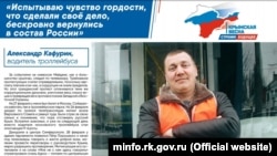 На фотовиставці представлена й історія сімферопольського водія тролейбуса Олександра Кафуріна. Він розповідає, що 27 лютого 2014 року хотів полетіти до Москви – працювати в тролейбусному парку. Але на мітингу 26 лютого біля кримського парламенту зустрів знайомих і наступного дня став «ополченцем» дев’ятої роти. Кафурін каже, що був одним із тих, хто зустрічав у центрі Сімферополя народного депутата України (на той момент) Петра Порошенка.