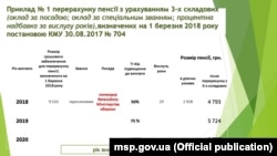 Мінсоцполітики навело кілька прикладів. Так, комбат ЗСУ, який вийшов на пенсію у 1990-х, отримуватиме цього року 4 793 гривень пенсії, а у 2020 році вона становитиме вже 6 657 гривень. На сто гривень більше отримає, наприклад, пенсіонер МВС, який пішов з посади у 2000 році у званні майора, наводять приклади у Мінсоцполітики.