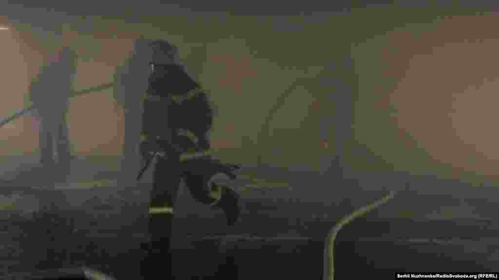 За попереднім планом, у зоні паркування, рятувальники імітують справжню пожежу, підпалюють раніше підготований папір, який загоряється майже миттєво. В якусь мить спрацьовують сплинкери, збігається охорона із вогнегасниками й спецрятівниками. До локалізації пожежі уже долучаються рятувальники, заливаючи місце горіння водою та піною. Дим поступово розсіюється.