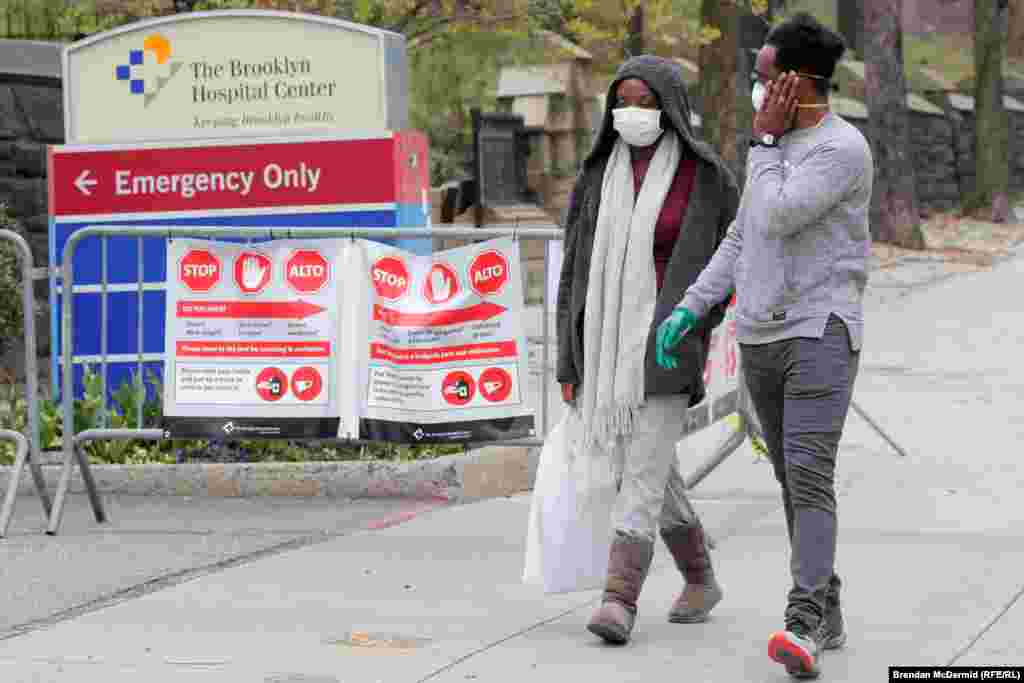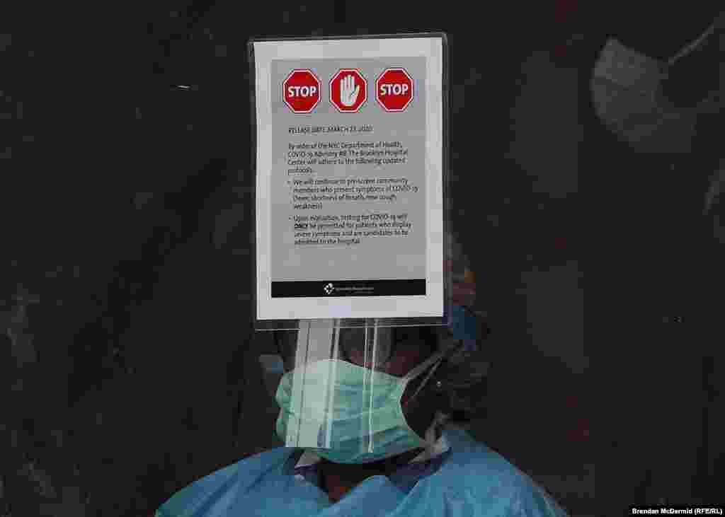 Охоронець у захисній масці біля медичного центру Wyckoff Heights у Брукліні.