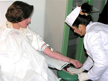Пані Наталя за свої сорок років кров здає сьогодні вперше в житті. Протягом години вона єдина пацієнтка. Каже, кров треба здавати, бо це елементарна допомога ближньому: “Я прийшла здавати кров незнайомій людині. Я - безкоштовно. Можливо, я би і взяла гроші, але комусь би їх віддала.” Слухати: