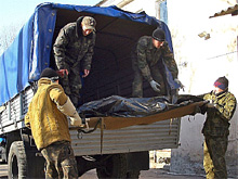 | Тіла загиблих шахтарів вантажать для доставки у морг. Донецьк, 19 листопада 2007 р. |