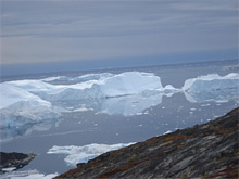 | Гренландія -- поодинокі айсберги на місці де минулого року було поле суцільної криги. |