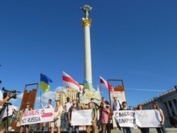 Білоруські та українські активісти зібралися на майдані Незалежності в Києві, щоб висловити підтримку білорусам, які демонструють бажання змінити владу шляхом виборів.