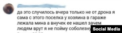 «Это случилось вчера, только не от дрона. Я сама с этого поселка. У хозяина в гараже лежала мина, а внучек ее нашел. Зачем людям врут? Я не пойму. Соболезную».