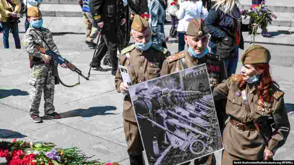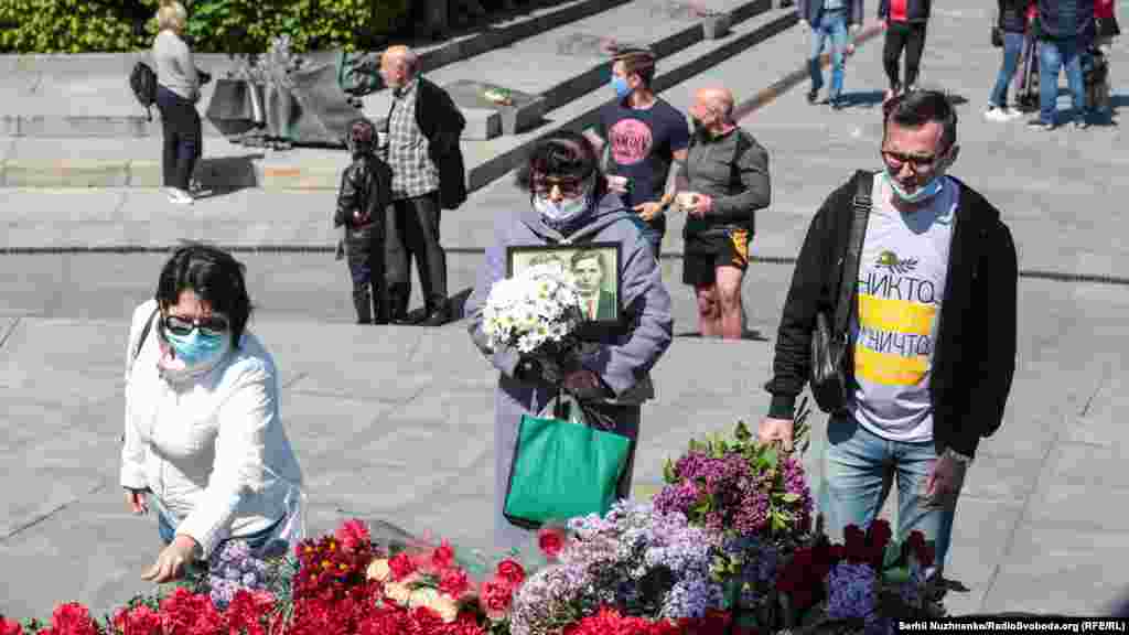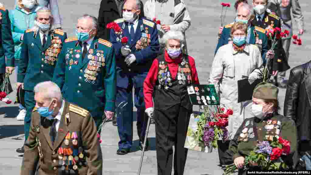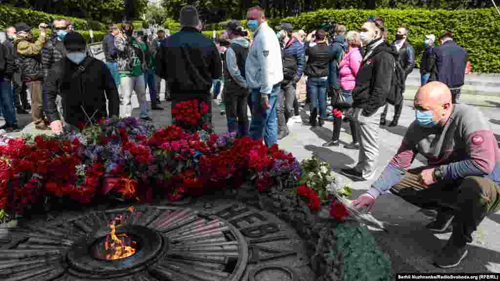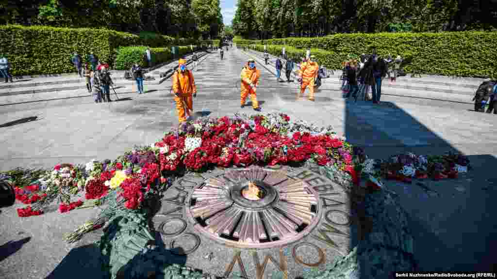 З ранку, 9 травня, до Вічного вогню у Парку Слави у Києві усі бажаючі несуть квіти, з нагоди Дня перемоги над нацизмом у Другій світовій війні. Поліція людей пропускає по двоє й попереджає про безпечна дистанцію в умовах епідемії. Крім того кожен обов’язково має одягнути захисну маску. Традиційно, заборонено носити комуністичну символіку, за наявність такої поліцейські складали протоколи. З квітами прийшов і очільник УПЦ (МП) митрополит Онуфрій, разом із народним депутатом Вадимом Новинським провели молебен. Раніше народний депутат заявляв, що у нього діагностували хворобу COVID-19. За неофіційною інформацією, минулого місяця коронавірус виявили і в митрополита Онуфрія, однак церква офіційно цього не підтвердила. Попри обмеження поліцією на вхід до Парку Слави, відкритою була територія «Національного музею історії України у Другій світовій війні». Детальніше дивіться у відео Радіо Свобода.