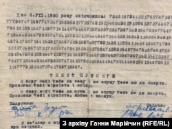 «Через пару місяців, я вже ходила у школу, приїхали мій дідусь і бабця по материній лінії. Вони теж відбули покарання, заслання і повернулись у своє село. Мабуть, ці документи з пляшки бабця Гафія віддала рідним мами. Мене забрали у Старий Лисець. Хата, в якій мама жила, була знищена. Дідусь був дуже добрий коваль. Залишилась стодола, але була вона велика. Всі там ми і жили – дідусь, бабуся, шість маминих сестер і я. Але я дуже сумувала за другою мамою – бабцею Гафійкою. Мене вона відвідувала, мене тягнуло в Яблуницю, туди мене возили щоліта», – пригадує Ганна Марійчин.