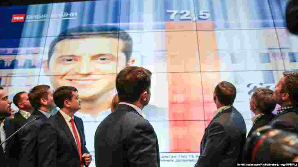 За результатами Національного екзит-полу, лідера перегонів Володимира Зеленського підтримали рівно 73% виборців, чинного президента Петра Порошенка – 25,5% учасників голосування. У результатах, оприлюднених одразу після закриття виборчих дільниць, Зеленський мав на 0,2% підтримки більше, Порошенко – настільки ж менше. Що відбувалося у штабі Зеленського - в фоторепортажі Радіо Свобода.