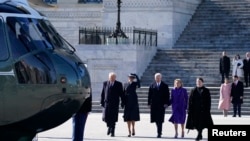 Після офіційної частини в Капітолії: з будівлі Конгресу США виходять президент Дональд Трамп, перша леді Меланія Трамп, та колишній президент Джо Байден і екс-перша леді Джіл Байден.