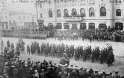 Американські війська (л) крокують перед бійцями союзницької російської Білої армії.
