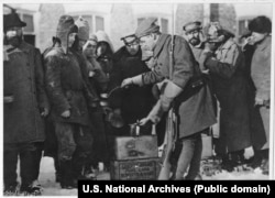 Американські солдати годують рисом більшовицьких полонених, січень 1919 року.