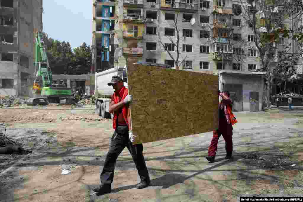 У Солом'янському районі Києва на другий день після російського комбінованого обстрілу, в результаті якого був зруйнований цілий під'їзд багатоповерхівки, тривали пошукові роботи. Рятувальники продовжували розбирати завали в пошуках зниклих безвісти. Київ, 18 червня 2025 року
