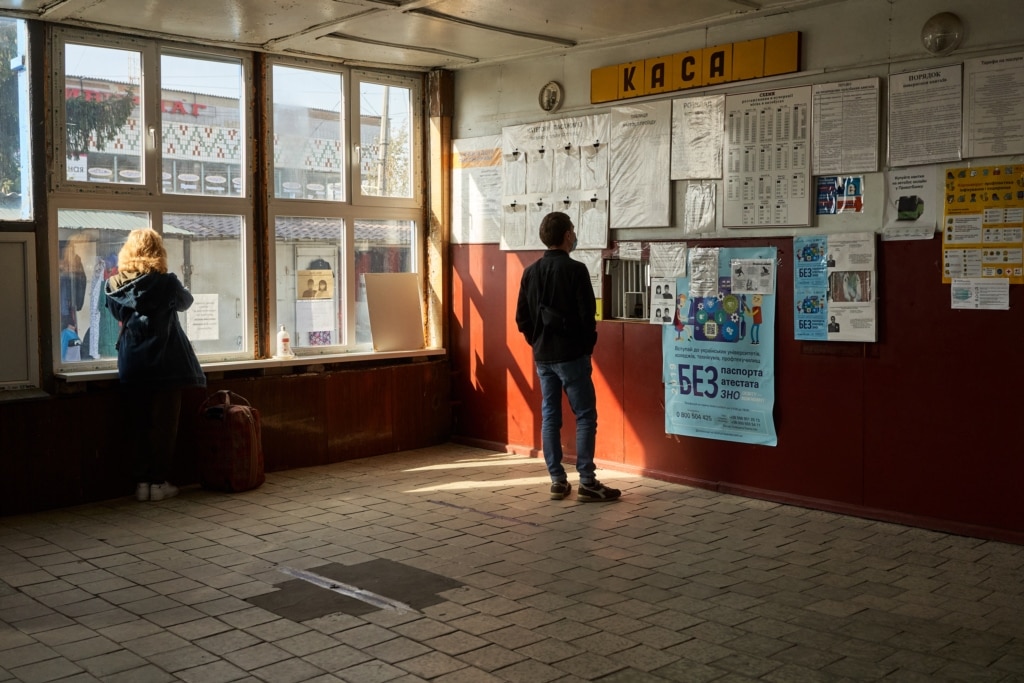 «Хлопці, вам куди треба?» – голос диспетчерки місцевого автовокзалу з віконця відриває нас від розглядання розкладу руху: Станиця Луганська, Рубіжне і навіть нинішня «столиця» Луганської області Сєвєродонецьк. Половина автовокзалу просто закинута, як у Прип'яті – згодом ми дізнаємось, що тут у «кращі часи» був бар. «Ви зараз обнадієтесь, думаєте, поїдете – а поїхати ви в мене не поїдете!» – жінка незлобиво сміється з явних зайд. Виявилось, що автобус ходить тільки до 8-тисячного Біловодська у 40-ка кілометрах звідси – і тільки двічі на день. «Чому ж не знімете?» – питаємо про розклад. «Не можна знімати! Воно ж завірено не нами, хлопці!»