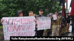 Цю колону пікетувала невелика група громадських активістів з плакатами на кшталт «Вермахт – за Рейх. Сталін – за совок. УПА – за Україну», які вигукували «Слава Україні!». Їх розділяв кордон поліції. Далі словесних перепалок не зайшло.