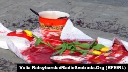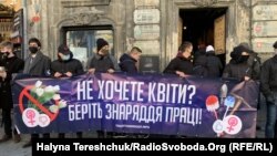 Неподалік зібралася невелика група молодих людей, які назвалися представниками праворадикальної організації «Традиція і порядок». Вони тримали плакат «Не хочете квіти? Беріть знаряддя праці».