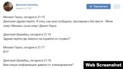 Також Шкребець опублікував повідомлення рідних російського військового Сергія Грудініна, який перебував на крейсері «Москва» і зник безвісти. Вони хочуть дізнатися правду про долю рідних.