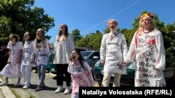 Поряд з проросійським мітингом свою акцію протесту влаштували українські активістки. Три десятки жінок, одягнених у біле вбрання заляпане червоною рідиною, скандували «терористи» і «фашисти».
