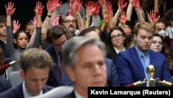 Протестувальники з руками, пофарбованими червоною фарбою, неодноразово переривали слухання в Конгресі щодо військової допомоги США 31 жовтня, вимагаючи від Вашингтона припинити фінансування боротьби Ізраїлю проти «Хамасу». Про це повідомляє агенція AFP.